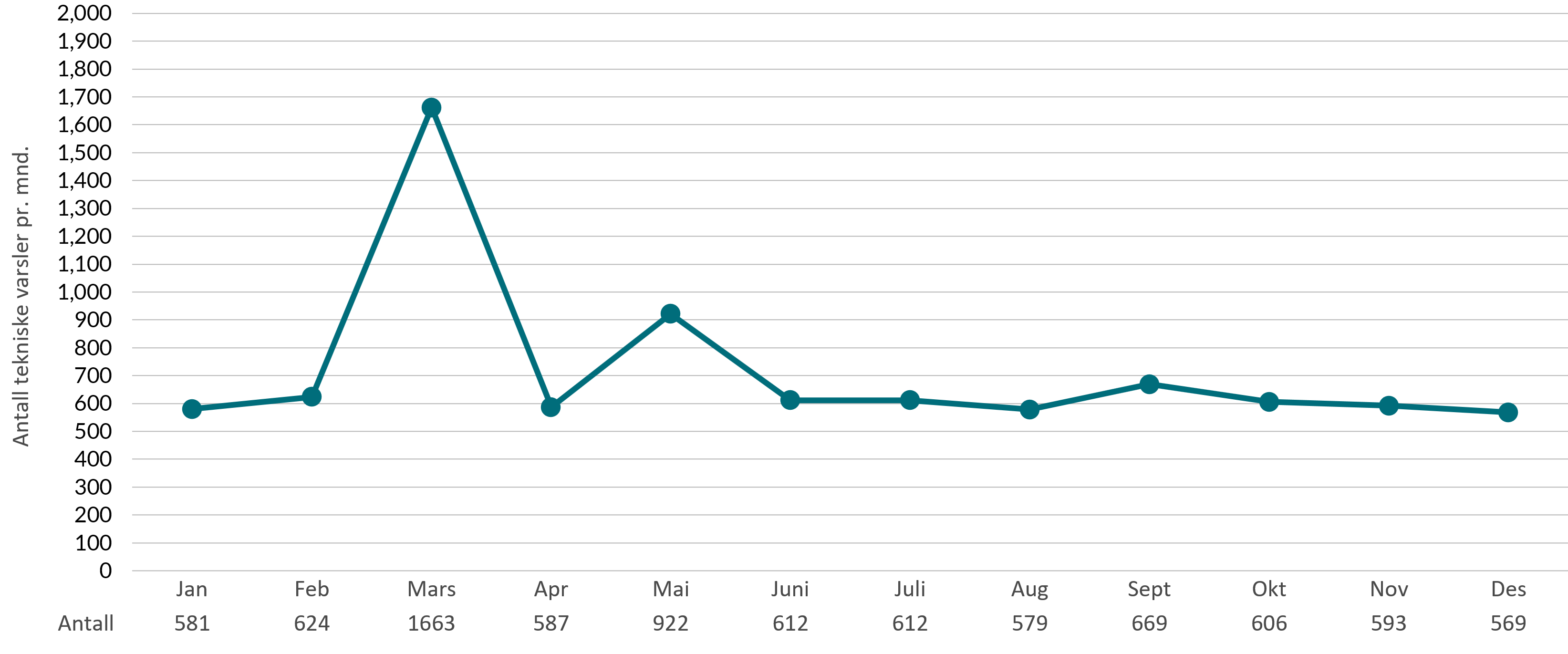Til forskjell fra første halvår der vi hadde noen topper på tekniske varsler pga nedetid, jevnes disse varslene ut i årets siste måneder. Det er en nedgang i tekniske varsler på 27 % fra første til siste halvår. En av årsakene til nedgangen kan være at teknologien er mer stabil og at tjenesteutøverne i våre samarbeidskommuner har fått høyere kompetanse innen bruk av velferdsteknologi.
